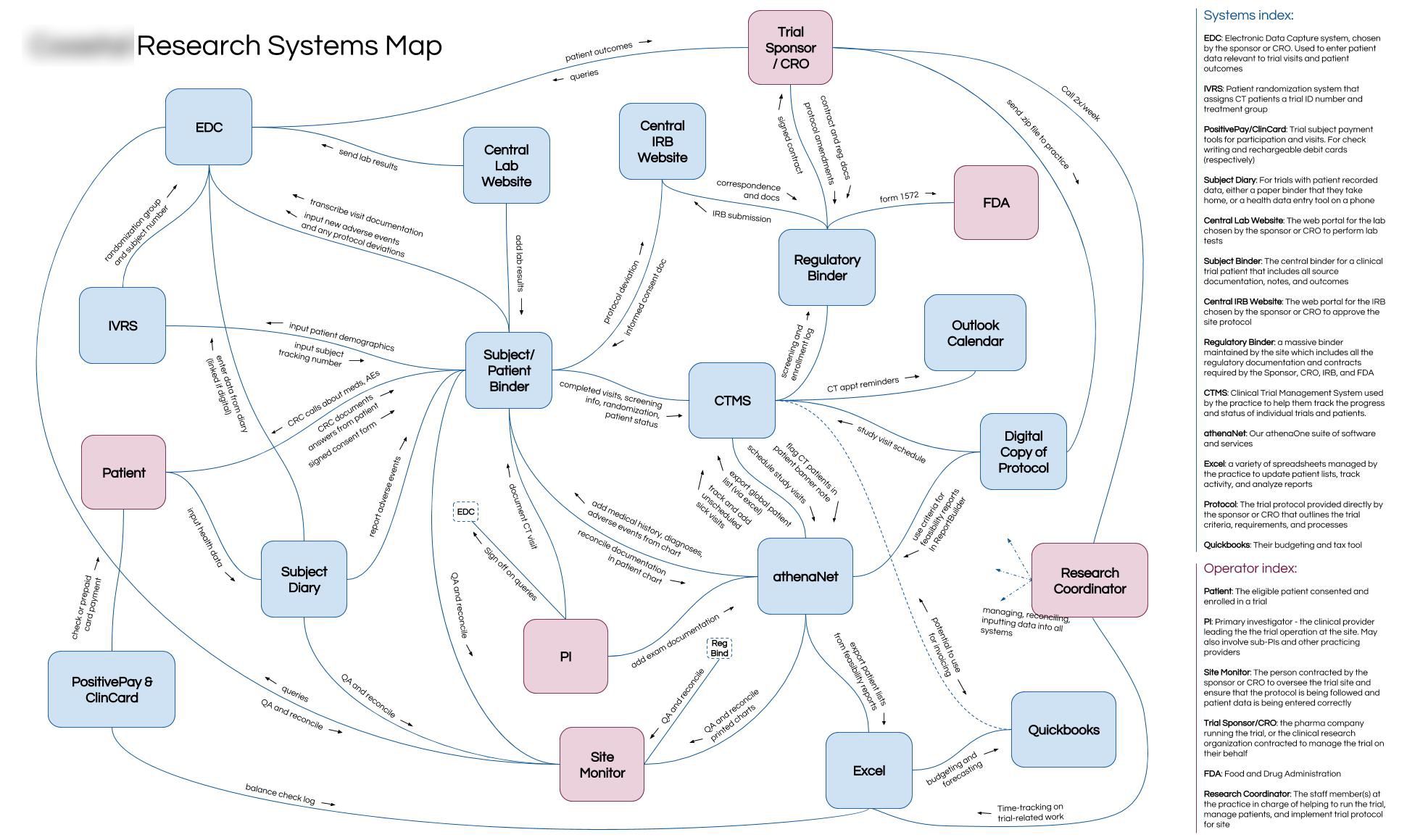 For this project, our team explored and piloted new business ventures in clinical trials management for physicians, research sites, and pharmaceutical clients. I partnered with another strategic designer and a small pilot team. When I started, we had done some foundational research and were in the process of synthesizing findings into some themes and opportunities. I helped map these opportunities alongside the clinical trials journey