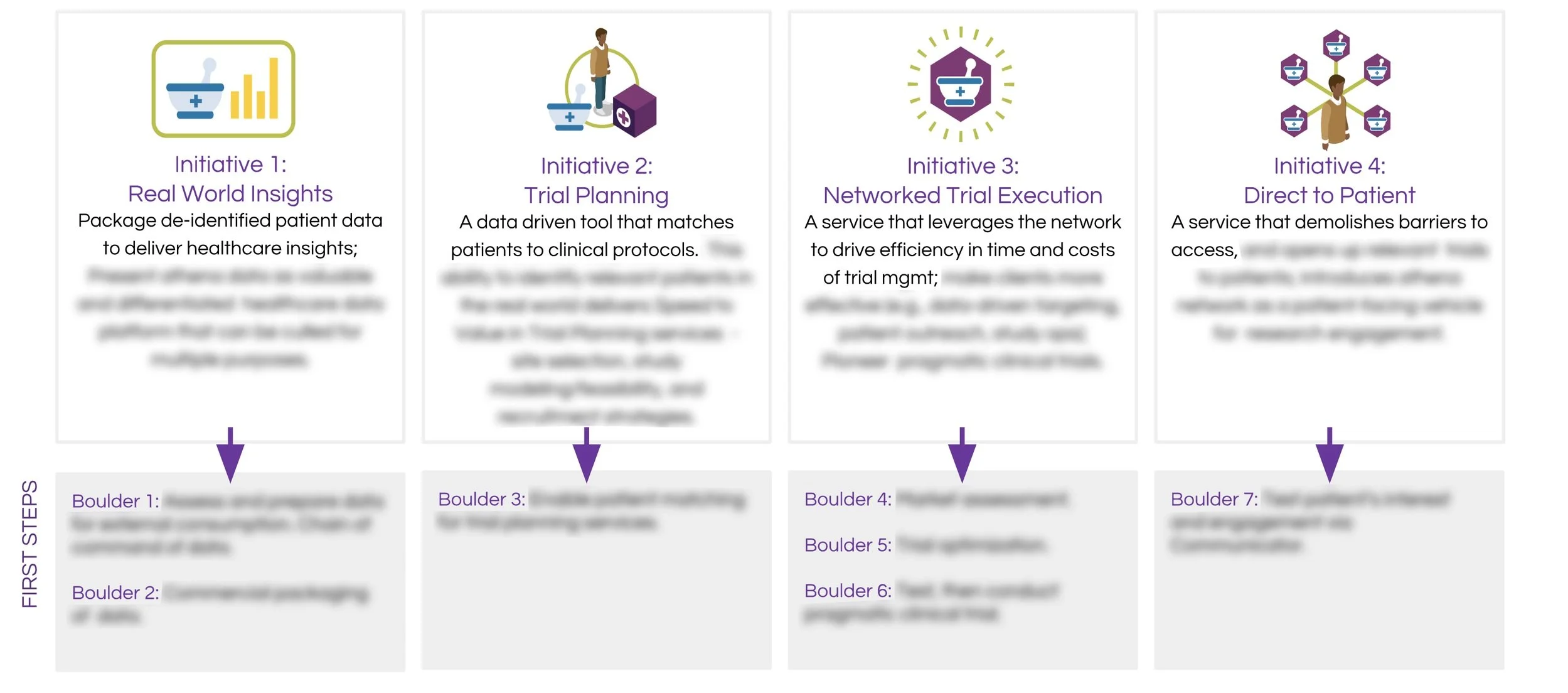 From this point, I helped our team define the value our services could bring to different users across the spectrum, with a particular focus on where we could be uniquely differentiated from the market. We then took those value propositions and reframed them as separate initiatives and boulders. This became the framework for our product roadmap, and helped us prioritize where to start and which assumptions we wanted to test first.